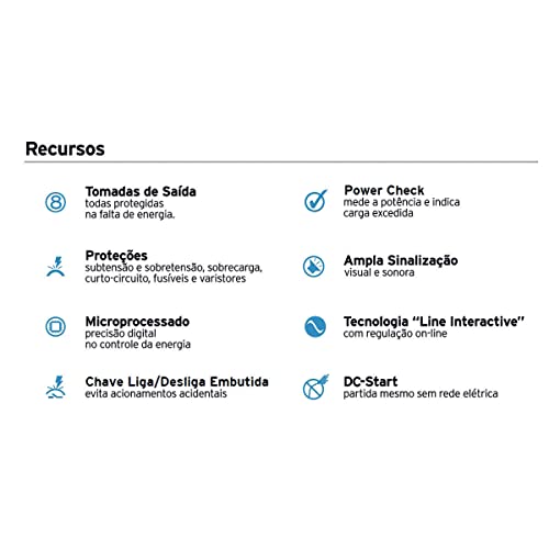 - True RMS raro em nobreaks desta categoria permite uso com geradores